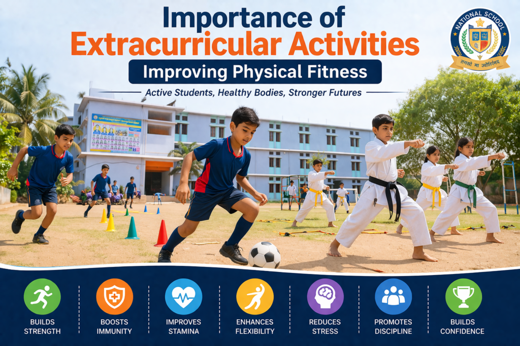 Importance of Extracurricular Activities is also linked to physical health and fitness. Activities such as school sports programs, karate for physical fitness, and outdoor games for students help children stay active and healthy. Regular participation improves stamina, strength, and overall well-being. Schools that focus on sports facilities in schools ensure students maintain a healthy lifestyle along with academic learning.